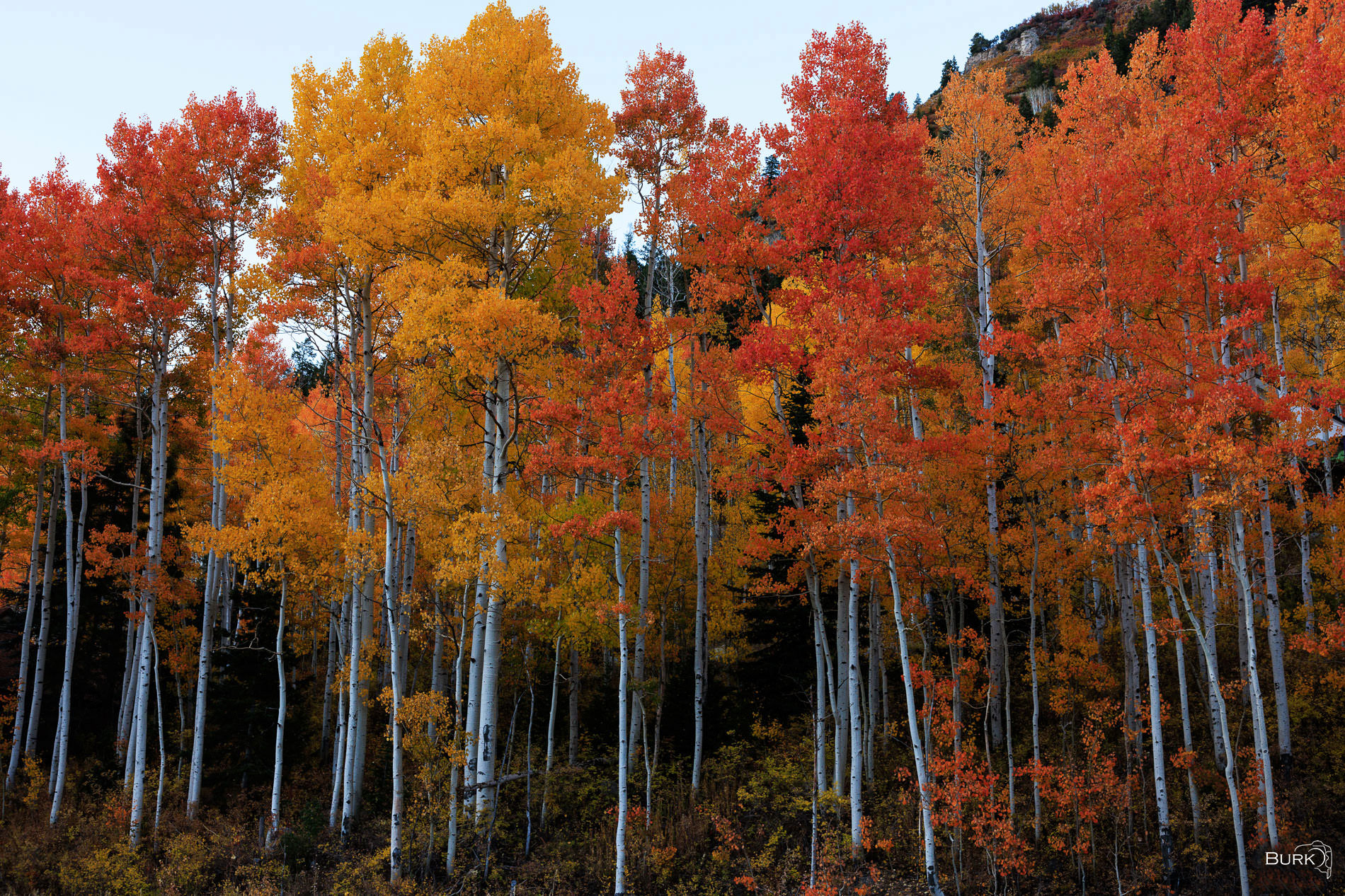 On October 14, 2022, I took a drive toward the top of Big Cottonwood Canyon and came across this remarkable stand of aspen trees near the canyon’s highest point. It’s uncommon to see aspens displaying both vibrant yellow and deep orange together, making the scene especially memorable. While aspens are best known for turning brilliant yellow in autumn, some trees shift toward orange when higher levels of pigments called carotenoids and anthocyanins develop in the leaves, often influenced by sunlight, temperature, and seasonal stress. Photo © copyright by Brandon Burk.